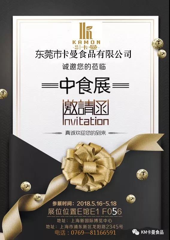 您好!非常感谢您一直以来对我们卡曼的大力支持。值此之际,卡曼谨向您参加上海中食展表示最衷心的邀请。地址:上海浦东新区龙阳路2345号/上海新国际博览中心 上海展会将举行于2018年5月16-18日,E1馆3号门 展位号F056